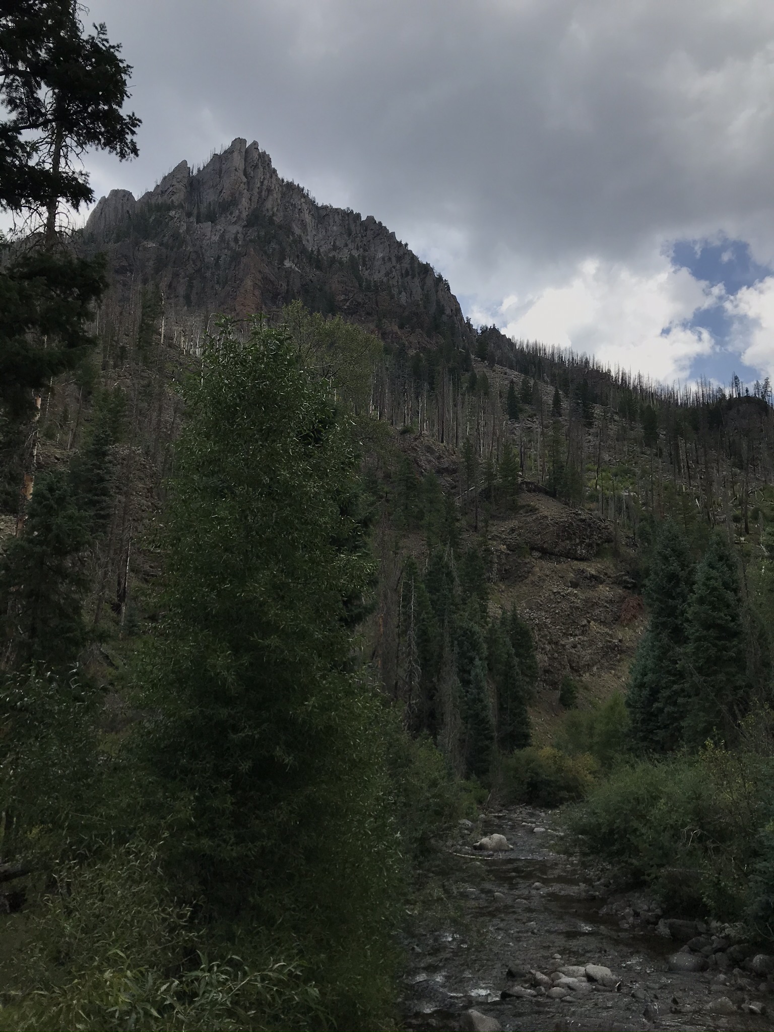 Several years ago, in 2013, the West Fork Complex wildfires decimated the area, spreading rapidly due to the beetle kill infestation. Beetle kill is a big problem on the west side of the Continental Divide. As the trees die they become fuel for wildfires. Lightning strikes sparked the fire, and the fire spread rapidly across the dead and dying trees. As a result, the West Fork Complex fire burned over 58,000 acres of the Weminuche Wilderness. The damage is clearly seen, but regrowth has begun. You will hike by new Aspen growth and many ferns and other new growth.